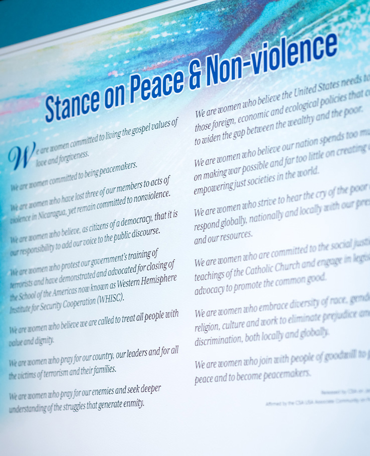 The Sisters of St. Agnes are women committed to being peacemakers; women who believe, as citizens of a democracy, that it is our responsibility to add our voice to the public discourse. “We are women who believe our nation spends too much on making war possible and far too little on creating and empowering just societies in the world.” These are words from the CSA’s Statement of Belief on Peace & Nonviolence.