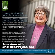 The Felician Sisters of North America's Justice & Peace and Integrity for Creation (JPIC) Office and Felician Services, Inc. (FSI), invite you to participate in a webinar with the captivating Sr. Helen Prejean, CSJ, whose Ministry Against the Death Penalty continues the momentum it built upon the publishing of Dead Man Walking in 1993. The webinar will occur at 6PM CDT on Tuesday, October 14.